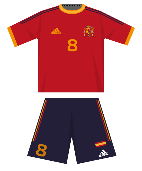 Home: The home uniform as worn by Gonzales, Ivangel and Blueno, is composed by a red shirt with yellow round collar, three dark blue stripes on each sleeve, the coat of arms of Spain on the chest and yellow numbers, blue shorts with three red-yellow-red stripes and blue socks. This is the 2002 FIFA World Cup home uniform.